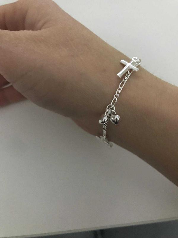 Christian Religious Multi Dangling Hearts Cross Charm Bracelet Polished .925 Sterling Silver