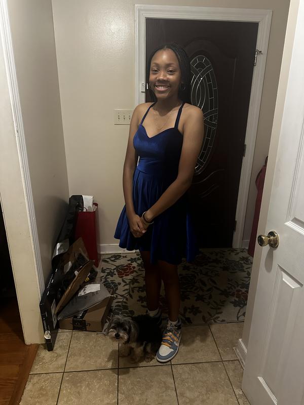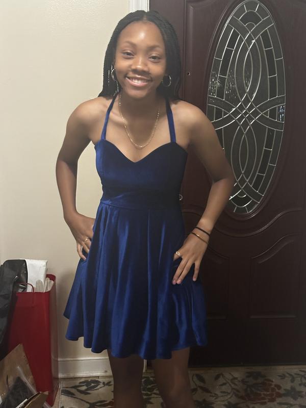 My teen wore this to homecoming and it was a hit. It was classic and elegant and fit her small frame well. The velvet added a modern feel to a traditional line dress. It was appropriate length wise and easy to adjust the fit using the strings in the back.