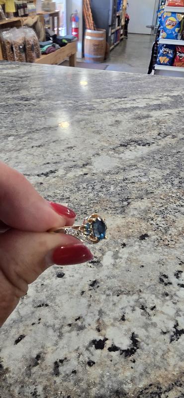 A beautiful ring, stones are blue as pictured. It's light so not a ton of gold but it was a nice surprise