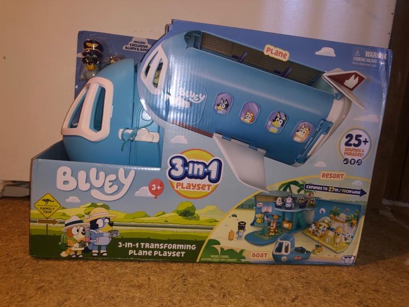 The Bluey S11 3 in 1 Holiday Getaway Airplane Playset provides fun, imaginative play with interactive features. My kids have enjoyed playing with this fun toy. I love the versatility of this playset in that it transforms from an airplane into a resort, and also into a boat which offers multiple "play" options. It's a large size playset too. The interactive features are great...it comes with over 25 sounds and phrases from the show--the kids love that. The playset includes 2 figures (Bluey & Bingo). The design of the playset is quite sturdy, and is so colorful which definitely captures the essence of the Bluey characters. A great addition to our household as the kids are big fans of the Bluey show.