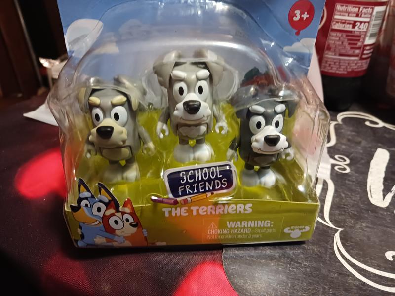 We got the Terriers as an addition to my 6 year olds Bluey toys. Proper moose toys. Well made durable plastic, meant to be played with. The pictures were taken while playing with our whole set. The review is meant for the Terriers 3 piece set that includes the 3 brothers. The brothers are all different colors of gray with different markings. True to the series.