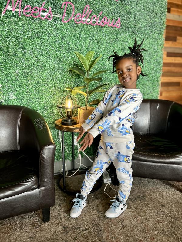 Your Bluey fan is ready to play in this stylish and comfy fleece outfit! This fashionable long sleeve shirt and jogger pants set features cute and vibrant artwork of Bluey and her sister Bingo that your kid will love to wear! Made of a soft material that keeps your child comfortable, this cool Bluey