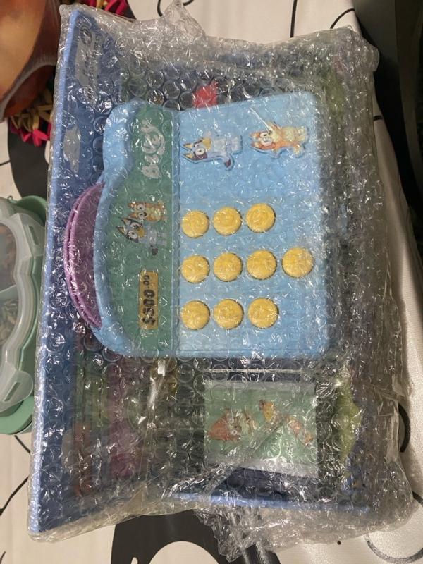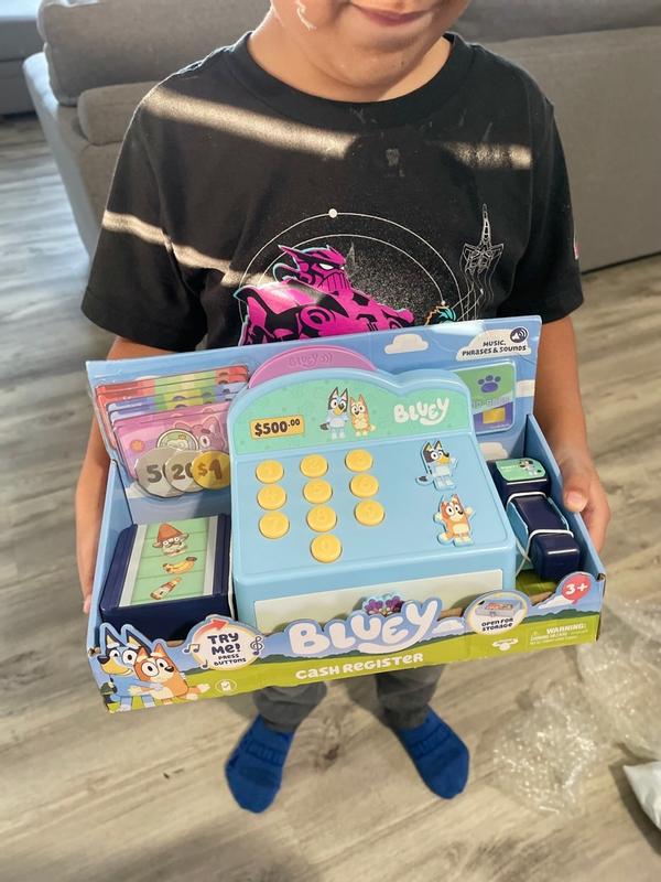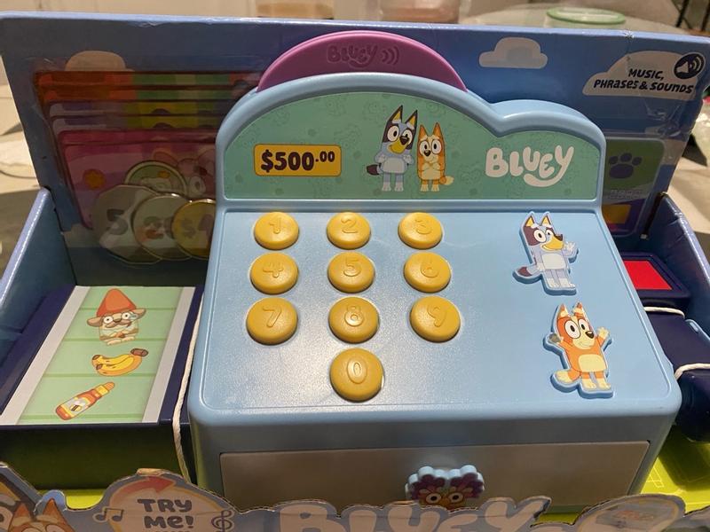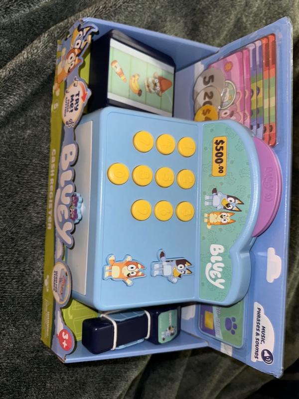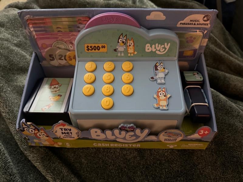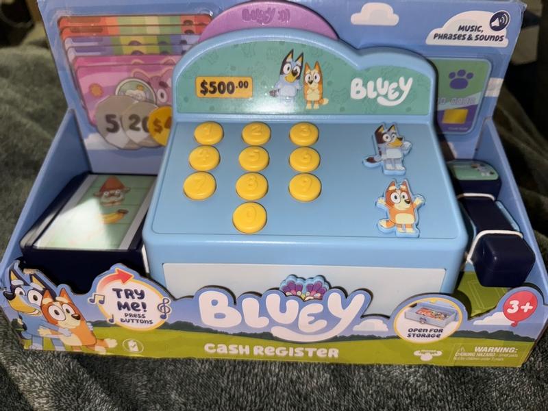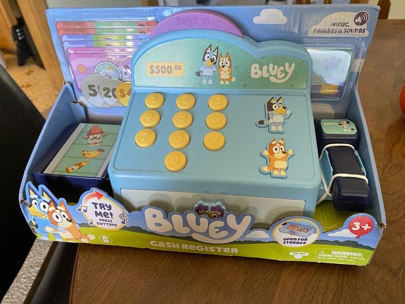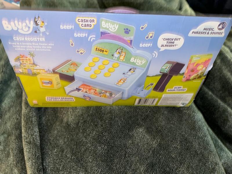 Join Bluey and her family in a world of imaginative play with the Bluey Cash Register. Explore endless adventures with realistic sounds and phrases, scan items with the scanner, and even use the credit card. Includes paper money and coins, plus 2 cans of beans. Let the role-playing fun begin.