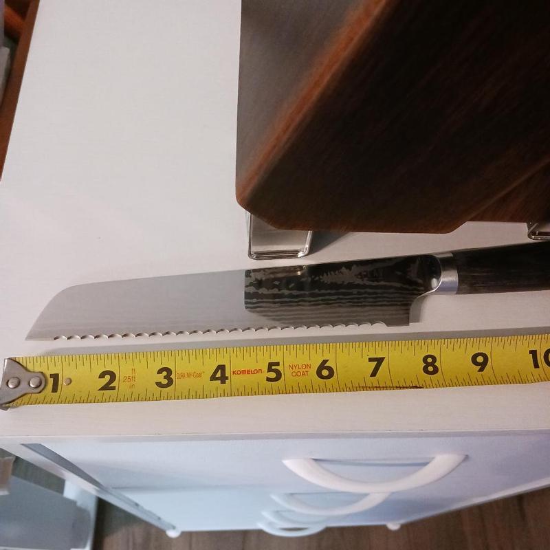 The block knife holder has a major design flaw, the 13.5 inch bread knife is to long for the block holder. The tip of the knife sticks out past the bottom of the block. The overall look and feel of the knifes is great. A Christmas gift that I am anxious to try, however the tip of the bread knife sticking out is a concern. Anyone else have this issue?
