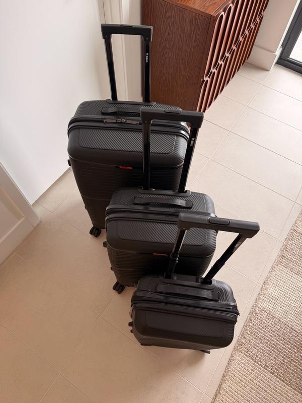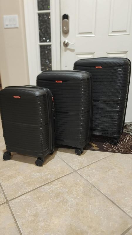 I received this product, complimentary in exchange from my honest review. The set is very sleek looking. The texture on the hard shell is a really nice touch. The locks on all three bags are easy to operate and have a TSA keyhole so they don't have to rip it apart if they need to open it. Each piece is slightly larger than my old luggage, but is still well within airline standards. It is all very lightweight as well - even the large piece. The wheels are very sturdy - which is a key component that we look at when purchasing new luggage. I feel confident that this set will survive our travels for a very long time.
