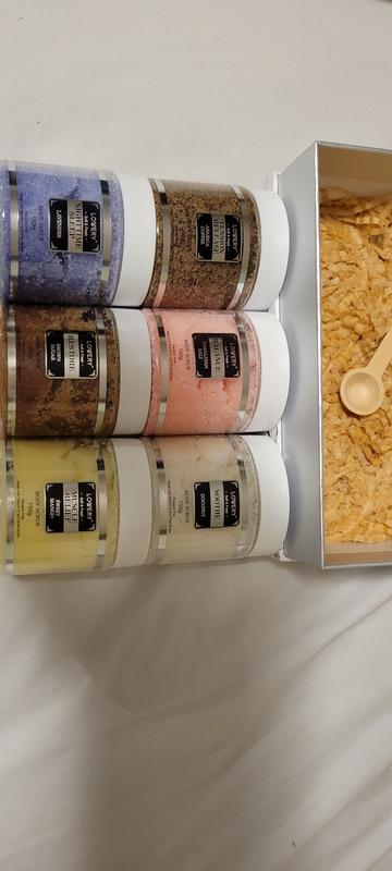 This scrub set is amazing! The marble looking box it comes in is very elegant and the scent variety is on point. The scrubs make my skin super soft and feel rejuvenated. The included wooden spoon make portioning and scooping the scrubs a breeze. A little goes a long way with these so they last a good amount of time. This would make a great gift to give to someone or to yourself for some at home pampering.