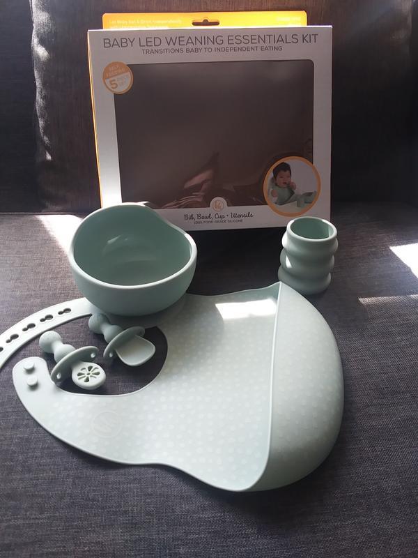 This Baby Led Weaning 5-Piece Essentials Kit is a must have for your baby. The kit has a bowl that suctions on to the table or high chair. The bucket bib helps with food dropping and with the mess. This set also includes a cup that's easy for your baby to hold. The fork and spoon are the perfect size for your baby to fed themselves.