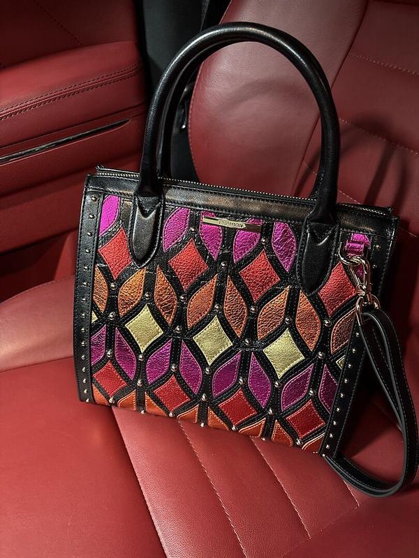 The red, orange, fuscia and gold diamond pattern is beautiful and works perfectly with my wardrobe. The interior compartments are multiple and there’s room for everything. My only complaint is that you need to use two hands to open the zipper.