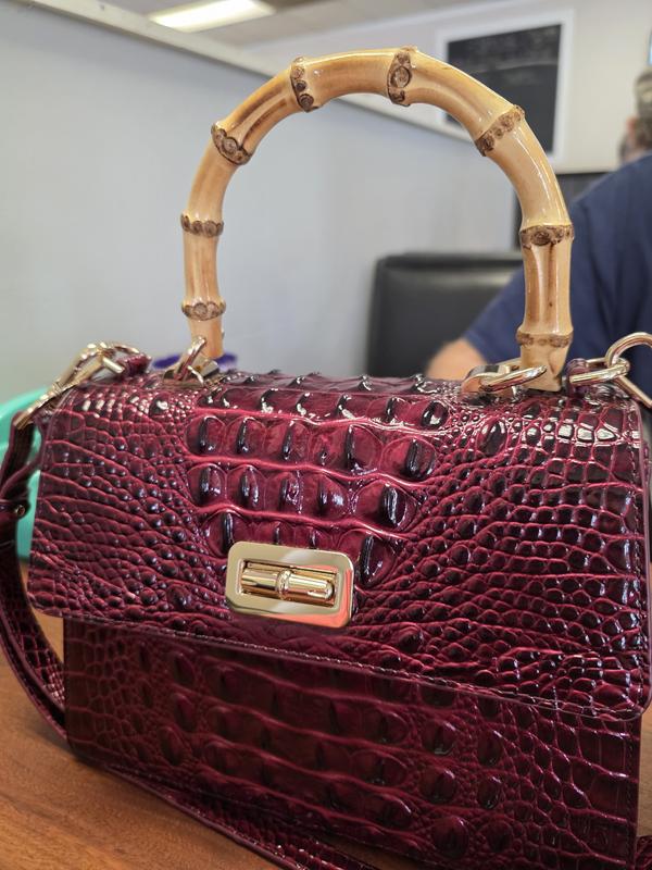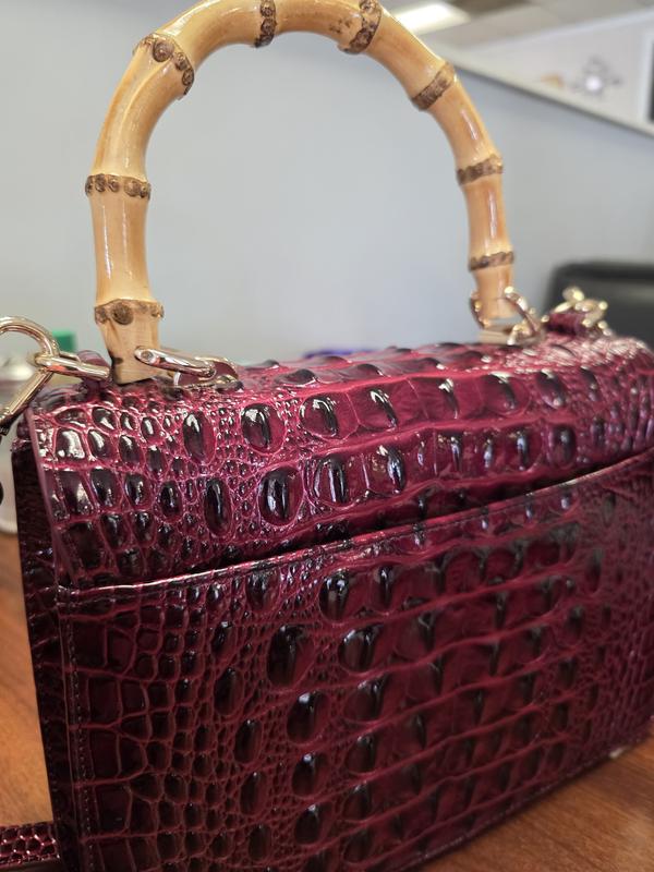 • 4-1/4"L bamboo-shaped top handles; 25"L double-up crossbody strap