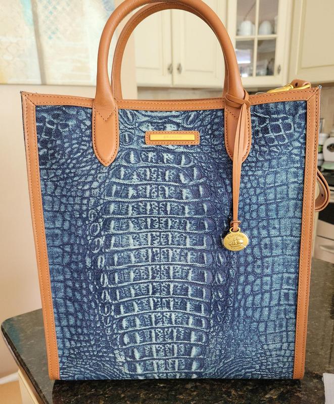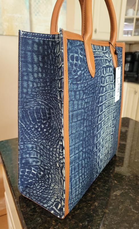 The denim is a rich classic blue with fading in all the right places. Bag sits upright, firm handles, and crossbody strap. Large enough for tablet, small Mac, water bottle and wallet. Great collection addition!