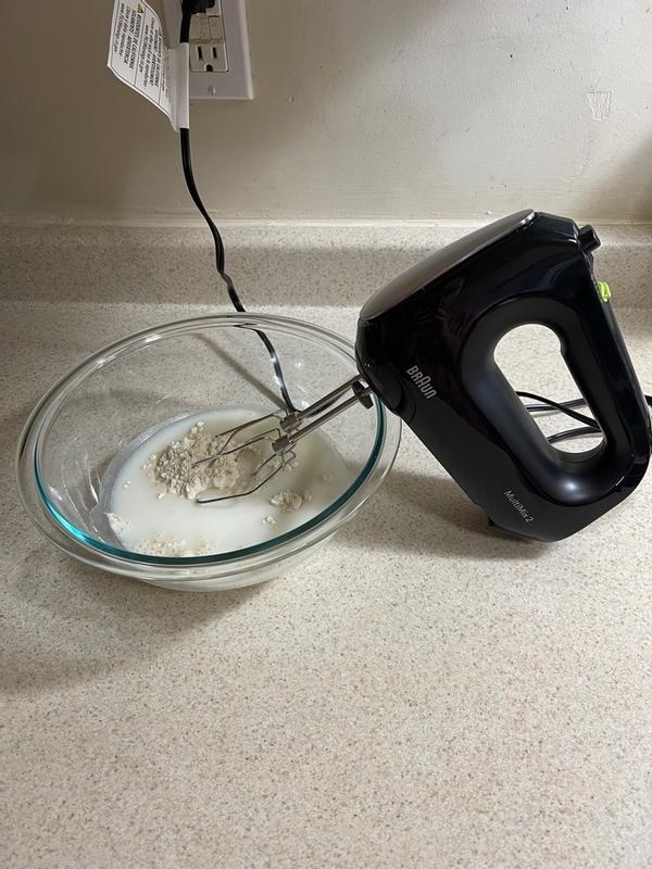 This electric mixer from Braun is great! Has a nice sleek design(love the black and stainless steel combo). It comes with 2 different mixing attachments, the normal beaters and then dough hooks. When done you can just throw the attachments in the dishwasher and then store them in the cool storage bag included. Definitely recommend!