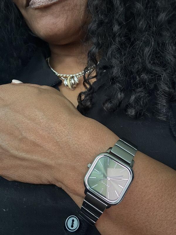 The watch is stylish, elegant, and refined. It is visually appealing with the contrast between the thin silver metal band and moss clock face. Much more lovely in person than the pictures - a must have!