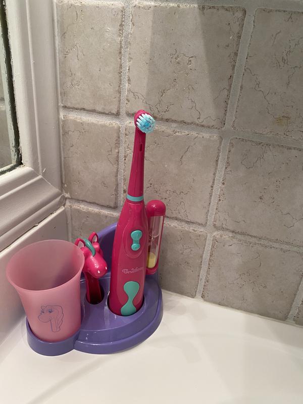 On a scale from 1-5, I would rate this kid's toothbrush a 5. I love that it has a cover for the head, the smaller head size for my daughter's mouth, the rinsing cup, and ESPECIALLY the timer and sticker chart. Brushing time has gotten better and she is more motivated to brush regularly. Thank you for providing a product with all the features in one!