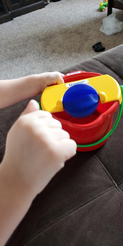 This bucket and shovel set is perfect for a toddler. I loved the primary colors of the set. When water was added to the wheel at the opening of the bucket it spun easily. When it first started working the movement was a bit sporadic but when you pour on the right spot it moved quickly. My kids (3 years and 2 years) have liked using it at their water table and at the splash pads. My only complaint is that the shovel does not fit spade side down inside the bucket when the wheel is on top. You can fit the handle in the space and that is it. Everything is still contained but I would prefer the spade to be down.