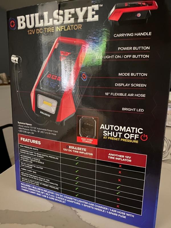 5/5 Stars I'm absolutely thrilled with my new BULLSEYE 150 PSI Handheld Tire Inflator! As a car enthusiast, I'm always looking for ways to improve my vehicle's performance and maintenance. This handheld tire inflator has exceeded my expectations in every way. Ease of Use: The inflator is incredibly easy to use. Simply plug it in, set the desired pressure, and let the device do the rest. The digital pressure gauge is accurate and easy to read, making it a breeze to monitor your tire's pressure. Speed and Efficiency: The inflator is impressively fast and efficient. It took me less than 5 minutes to inflate my tires to the recommended pressure. The sound and light alerts were also super helpful, letting me know when I've reached the desired pressure. Durability and Build Quality: The build quality of this device is top-notch. The construction feels sturdy and robust, and I can tell it's built to withstand regular use. Additional Features: I love the extra features that come with this inflator, such as the sound and light alerts, which ensure that you don't over-inflate or under-inflate your tires. The device also comes with a convenient carrying case, making it easy to take on-the-go. Overall Experience: I'm so impressed with the BULLSEYE 150 PSI Handheld Tire Inflator that I've already recommended it to friends and family. It's a game-changer for anyone who wants to take control of their tire pressure and maintenance. If you're in the market for a reliable and efficient handheld tire inflator, look no further! Pros: Easy to use Fast and efficient Accurate digital pressure gauge Durable build quality Sound and light alerts Convenient carrying case Cons: None!