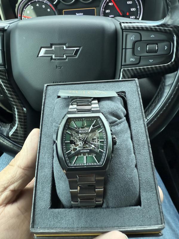 Keep exceptional time in distinctive style with the skeleton dial of this Bulova watch.