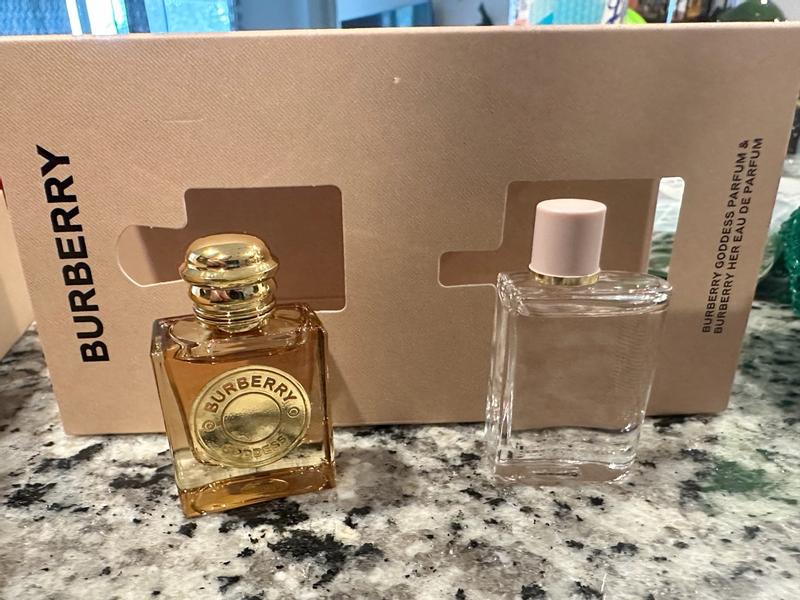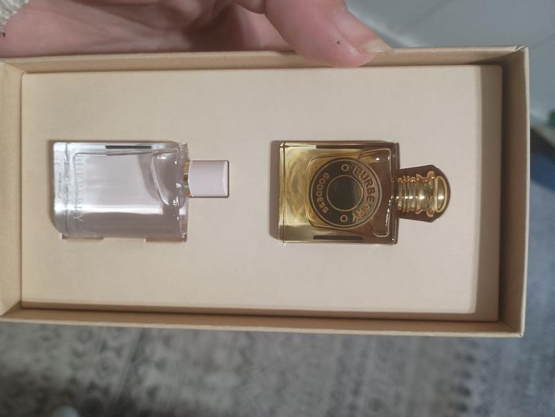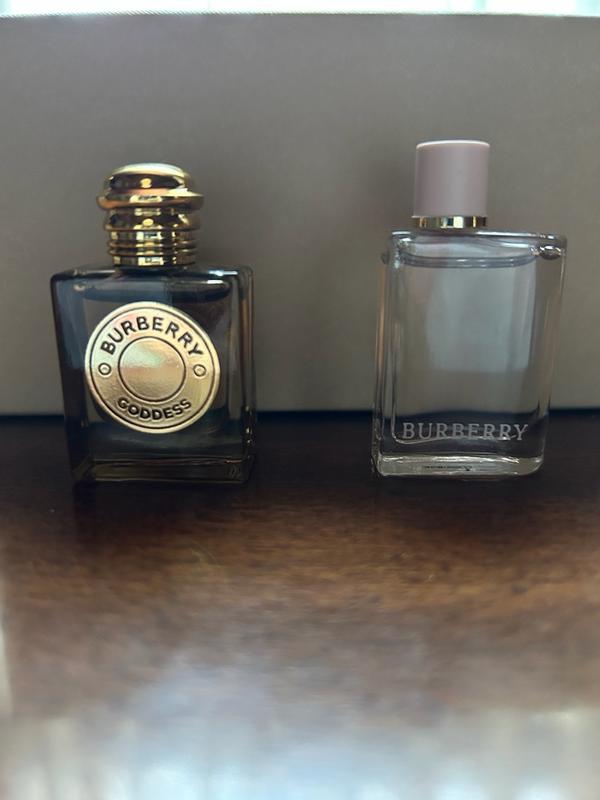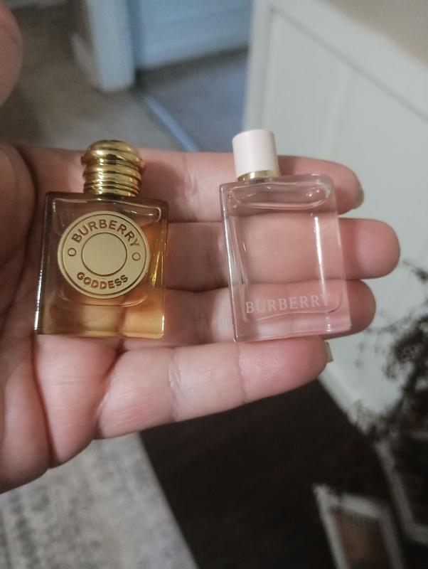 Cutest bottles of perfume. They are small, but powerful a little will go a long way goddess is more of a deeper smell where Burberry is a lighter fruit of your smell long lasting how they recommend.