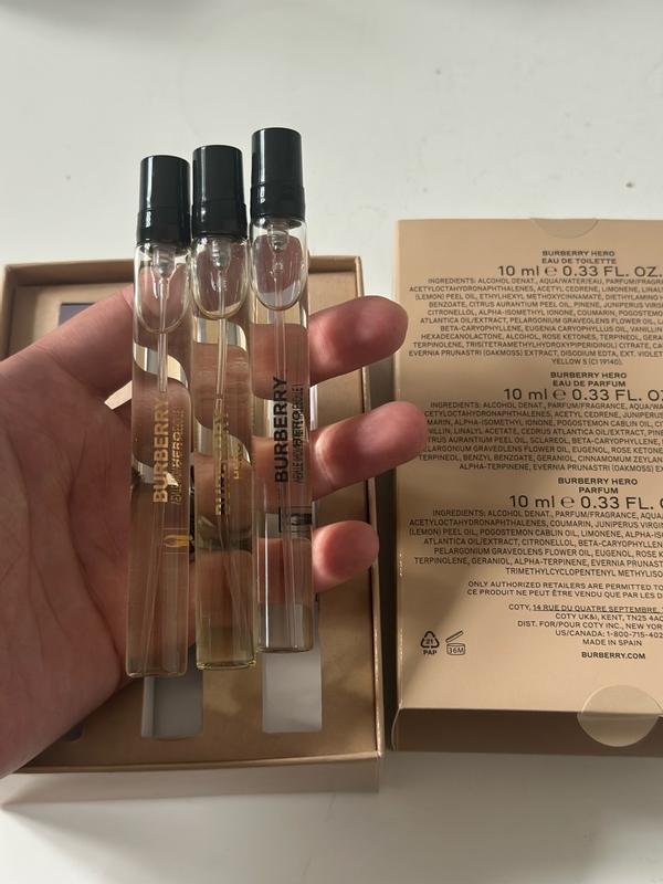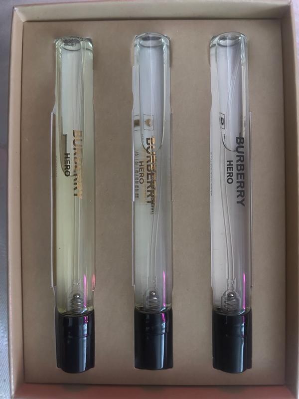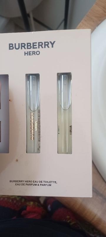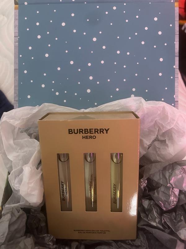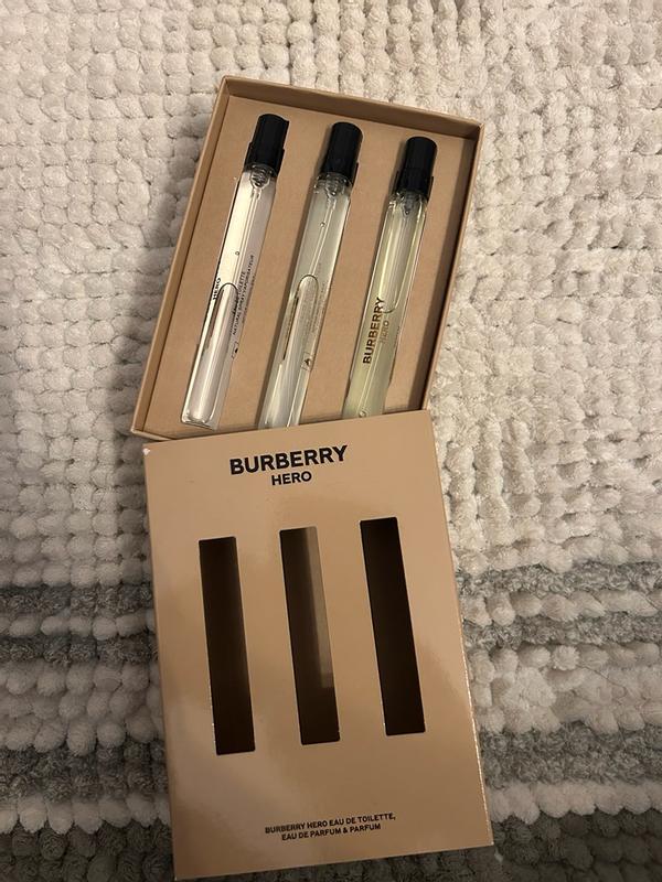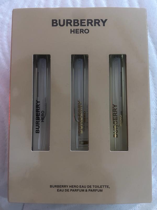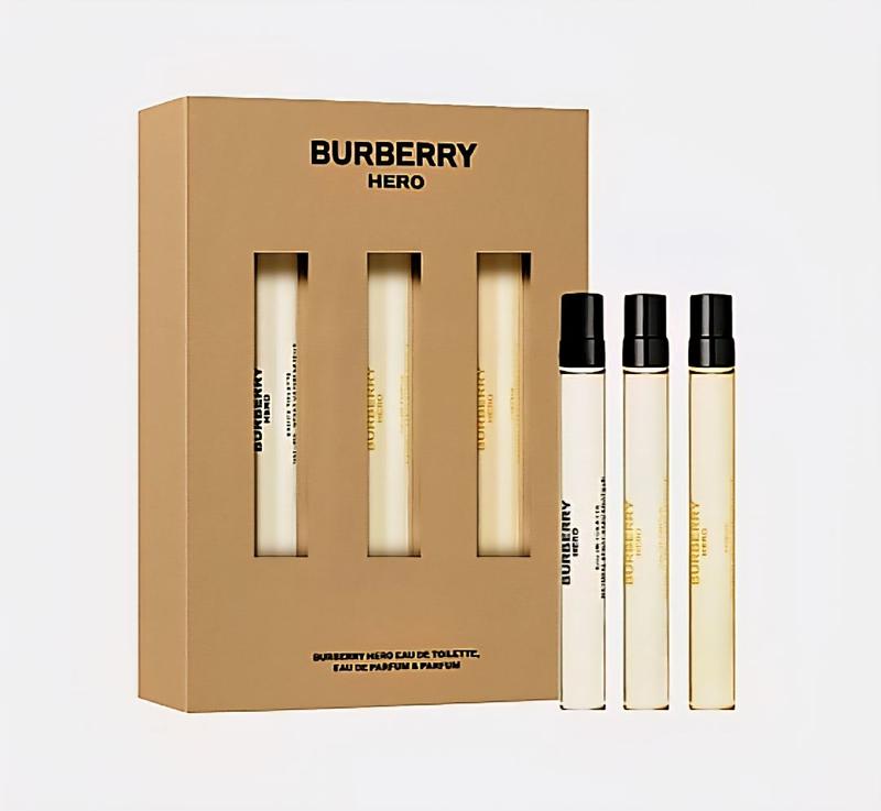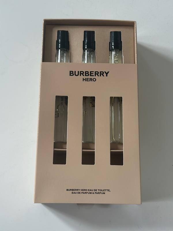 The Burberry Hero Trio Gift Set is the perfect present not just for yourself, but also for others. The three versions, Eau de Toilette, Eau de Parfum, and Parfum, are great options for different occasions. The bottles are easy to bring on your trips, having the right amount for carry-on restrictions, and providing an easy application on the go. The EdT is soft and delicate, with masculine notes and a fresh vibe. The EdP is a bit stronger and has a heavier presence, but it's still similar to the lighter version. The EdP is deeper, creamier, and very sweet, with a seductive layer. Kind of the one for special moments thanks to its rich personality with citric and botanical notes.