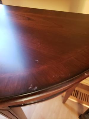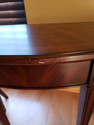 This was a highly anticipated purchase. The table pictured was beautiful and elegant looking. Shipping was very fast, almost too fast because the item I rec'd was damaged. This was either a return or used display. The box was intact, no holes or dents. The table has a deep gash across the front, a scratch across the top, and more scratches along the right-hand side. I immediately called the 888# for returns only for a recording to tell me that my hold time would be more than 30mins! I am really hoping that I can get some assistance with a return or replacement. Extremely disappointed!
