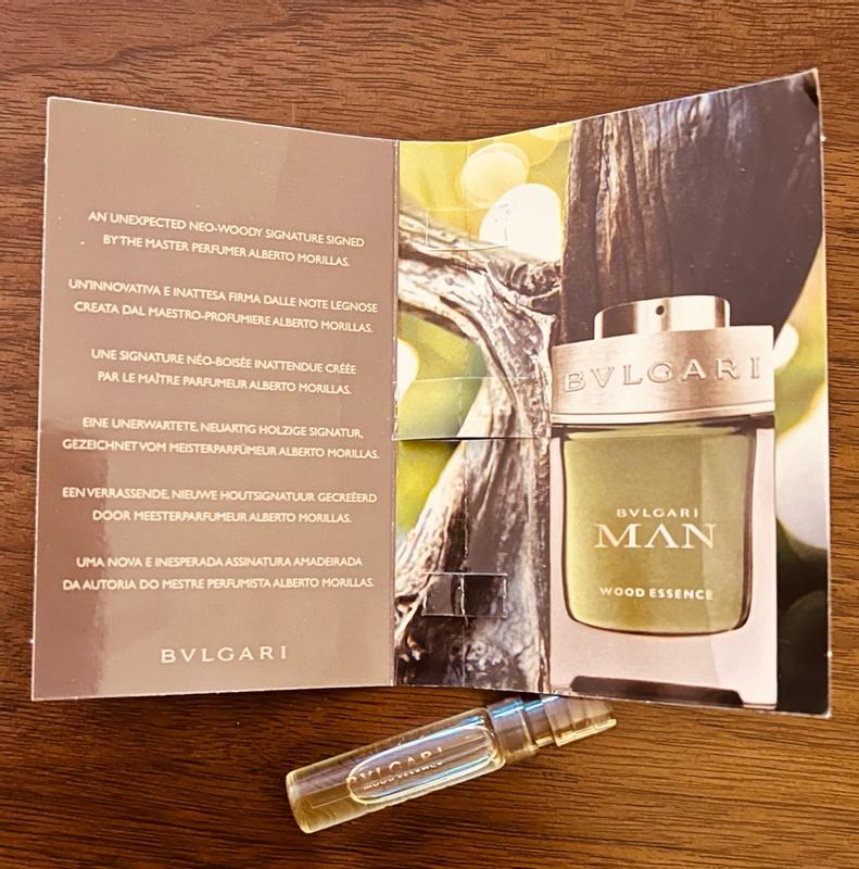 The Bulgari Man Wood Essence Eau de Parfum smells like cedar wood and lemon zest. It has an intense and long lasting smell, where a little goes a long way. The packaging matches what you would think. It is a light green tint to it, which makes you think of nature and trees.