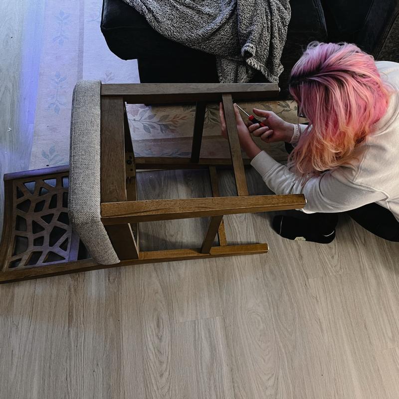 The chair is great quality - but the build was not the easiest to put together. Sometimes the manufacturing holes didn’t line up evenly. The color of the cushion is grey which goes beautifully with this wood grain