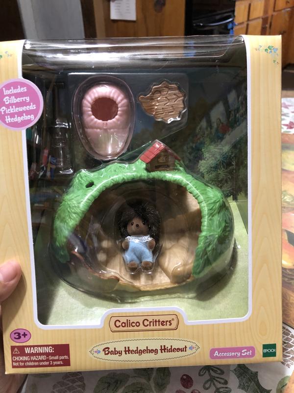 The Calico Critters Baby Hedgehog Hideout is a lot of fun for my 3 year old niece. It's really cute and comes with a little bed, a table, and inside the hideout there's room for a few other critter friends to hang out. He's wearing a cute little outfit and has soft bushy hair.