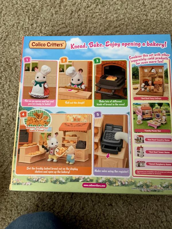 This cute little bakery comes with a cute little oven with the oven tray, cash register, sign, awning, shelf displays, table, hat and apron set, basket and tray, bakery tools, rabbit bun, squirrel bun, mouse bun, bear bun, cat bun, dog bun, panda bun, house bun, pumpkin bun, cream bun, boule, twist roll, rye bun, croissant, twist bun, batard, parisian, and a baguette. It's the perfect little French bakery for any little Calico Critters set. My daughter loves that this set goes perfectly with her other bunny sets as well.
