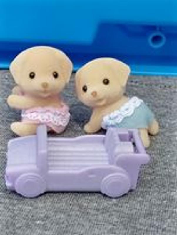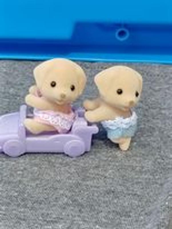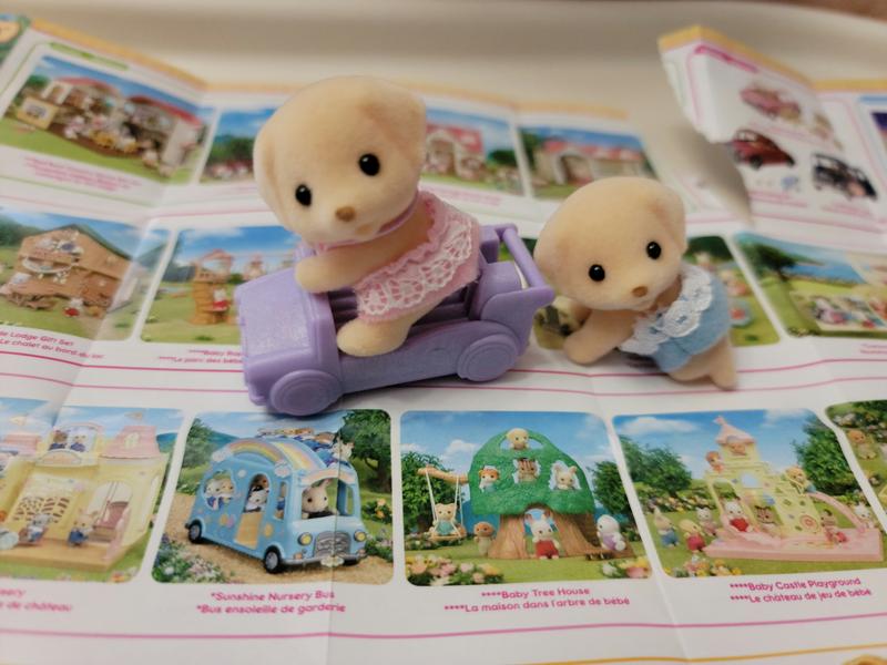 My little one has the Calico Critters dollhouse and loves to get new accessories so this set was perfect to add to her collection. This set comes with 2 yellow Labrador figures and a purple small ride on toy. One of the Labrador is wearing a pink dress and the other one has a blue diaper both of which are removable. These figures are super cute and soft! Both figures heads move so they are poseable. She loves to put the sitting twin inside the ride on toy while placing the crawling twins hand on the toy handle to push along the other twin. I love watching my little one have creative play time and using her imagination. My little has played so much with these twins since getting them and they have held up great. I will definitely be getting more of these Calico Critter accessories!