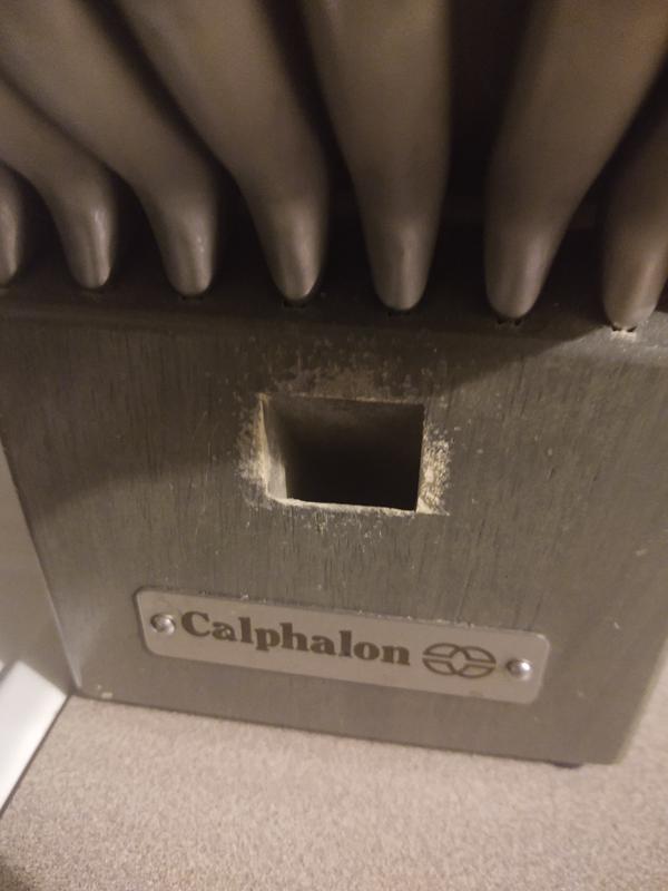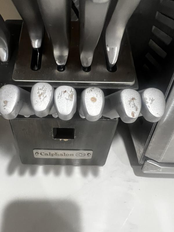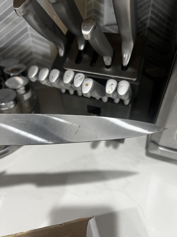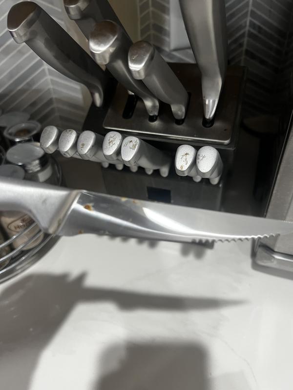My husband bought this for me a few years ago. Unfortunately, there are little areas that I am unable to clean properly on/in the block and my santoku 7” knife is damaged in three different locations. And we lost the scissors.