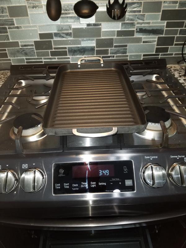I purchased this item to book burgers and veggies over the stove and grill. Cooks an entire packet of bacon at one time (time saver for me). I enjoy all of Calphalon's cookware. Easy to clean and fits over two burners on my kitchen stove.