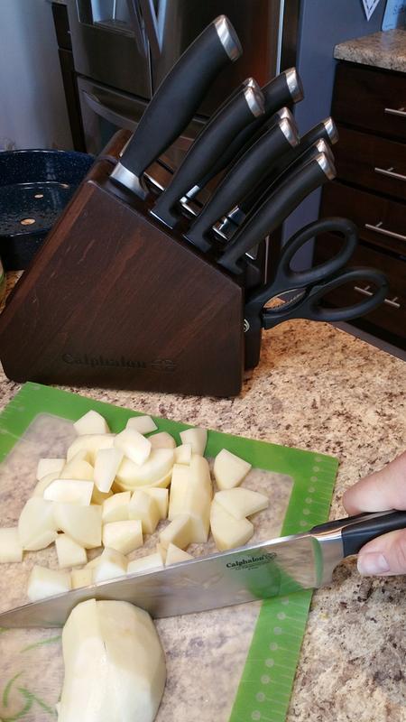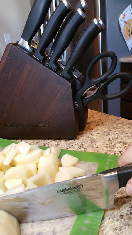 In exchange for my honest review, I was provided this product for free. I have a few Calphalon pots and pans that I swear by and use almost every single day, but I only recently discovered that they have knives, too! I am really happy with my experience of using this knife set in my cooking prep. I use the Santoku knife the most and it’s well-balanced and easy to manage. I used the bread knife on Thanksgiving on two baguettes for our guests, and it precision-sliced right through the tough crust. The knife block is skinny and takes up very little counter space in my already-teensy-tiny New York City kitchen. The built-in sharpening slots are an awesome feature that I think gives Calphalon an edge over similar products and competing brands, no pun intended :) The knives I owned before this were almost a year overdue for a sharpening, so I’m glad I don’t even have to think about it now. This knife set has just the right selection and versatility, too. Not too many, not too few.