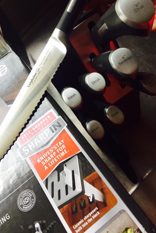 My son says I always complained about how dull my old knives were. And so when I was given this 10 piece knife block set to try and review, I was excited but skeptical. The built-in ceramic sharpener is such a great idea - I have never seen that before and it makes so much sense! When I say that these knives are sharp, that is no joke! I had no idea how bad my other knives were honestly until I got to use this set. Wowza. I also love that it's a space saver and fits so nicely on my counter top for easy access. I also like that they have labels on the handle so you know which knife you're pulling out to use. They feel so sturdy in your hand and that is the Calphalon quality shining through. I truly love them and because I rarely give anything 5 stars (I'm stingy that way), I'm giving it 4 stars which is awesome in my book.