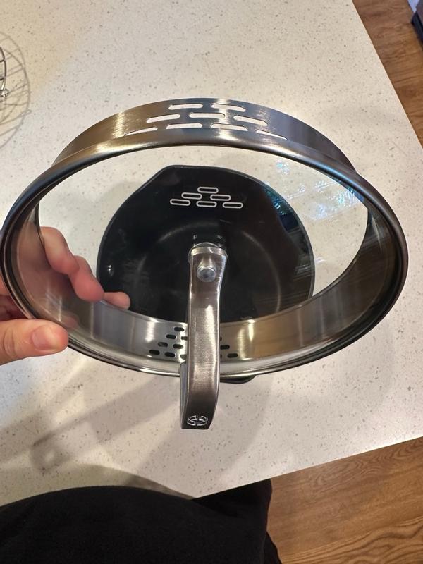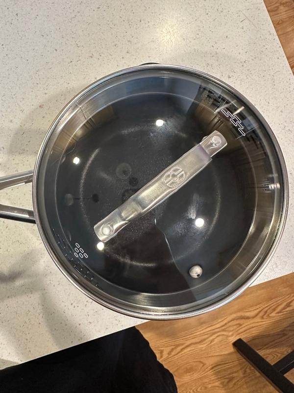 I purchased to add to my Calphalon collection but was disappointed with the design of the lid. It is deep for straining purposes and not stackable.