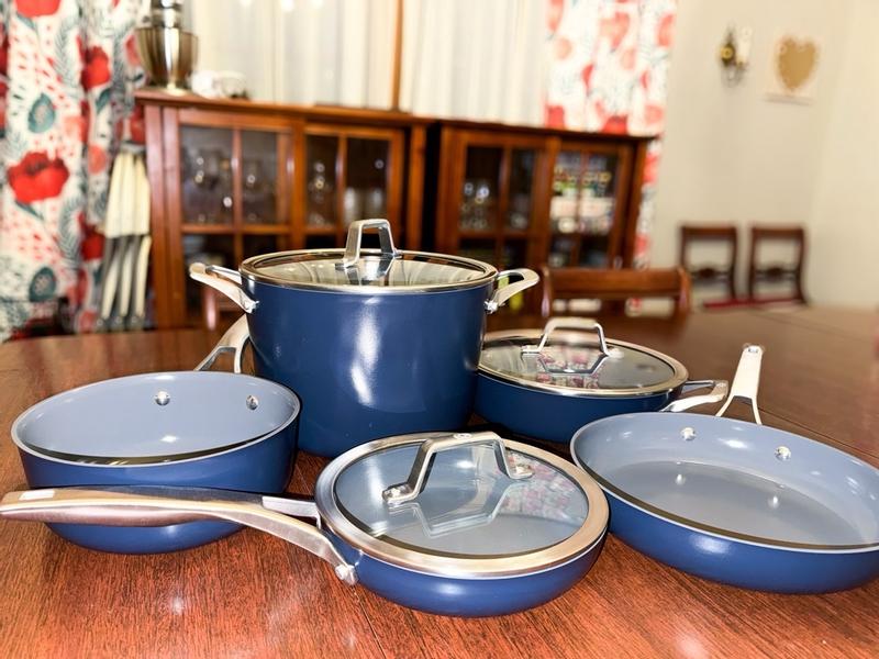 Loved this set! Beautiful and so easy to clean. My husband loves eggs and they slide right out. The blue color looks really good if I serve it out of the pot. I searched all kinds of cookware sets and this by far was the best pick. So glad I didn’t go with some other brand.