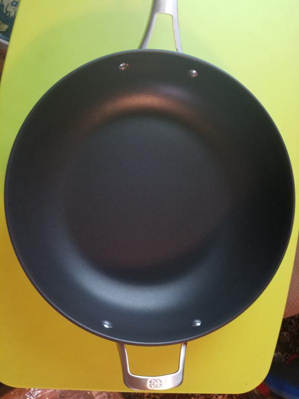 This is an excellent pan. Zero complaints so far. I'm so glad that it has handles on both sides because it is rally difficult to pick up own handed.