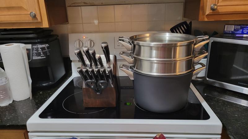 What a pot! My kiddo has already dubbed it "her noodle pot" because of how easy it is to cook and serve her all time favorite food. Beautiful design, I love the stackable line from calphalon. The clear lids are so elegant and are so helpful with things like rice!