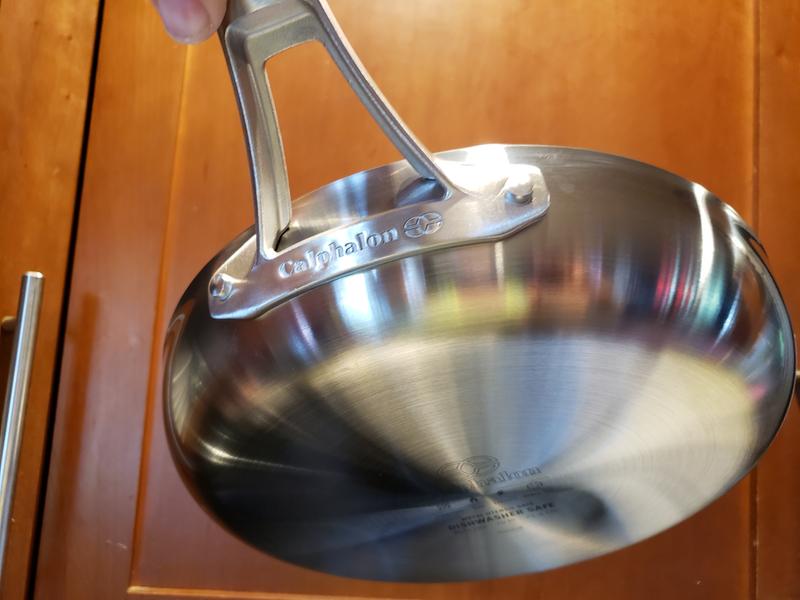 I’ve been using the Calphalon Premier™ Stainless Steel 5-Quart Sauté Pan for about 6 weeks now, cooking everything from stir-fried vegetables to chicken thighs and homemade sauces. The fully-clad, 3-ply construction with the heavy-gauge aluminum core delivers very even heating — I can sear meat on medium without worrying about hot spots.