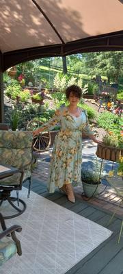 Lovely shades of aqua, apricot, moss, ivory...perfect for a wedding during the first week of summer! I am 5'3", weigh 175 lbs and purchased a perfectly fitting 12Petite. However...the bodice seemed a little big in that it did not 'cross over' and conceal the camisole beneath, so...I wore it loose/open like V-neck shown but with the solid color camisole peeking out, and got many compliments. (An option would have been to secure-stitch the fabric where I wanted it to conceal the camisole.) CK put a snap and thread chain at the inside shoulder to keep the straps of the camisole from slipping off your shoulders!)