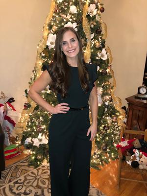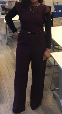 Loved the color and the fit! Runs long, so a good pair of heels will help you not drag the pants. The shoulder ruffles sure are a statement. True to size. Nice thick material and not see through.