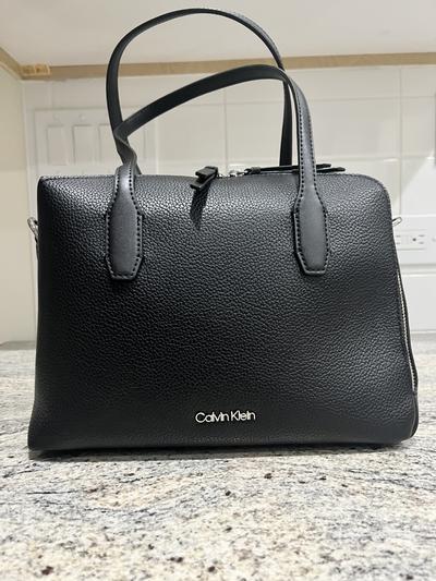 Calvin Klein has really designed a great purse that is both functional and has excellent quality. The purse is a soft black pebble leather, crossbody strap along with shorter handles, which is extremely useful while moving through your busy day. The crossbody strap is 55" long with the ability to shorten an additional 6" more. The elevated chrome hardware can be easily removed when not in use. A 26" zipper zips open/closed from the bottom corner of the purse to the opposite corner on a diagonal. This allows full access to the contents in your purse. Inside the purse is a large zip pocket along with two open pockets. Outside is an open pocket to slip in your phone/keys easily. I love this purse and I believe you will too!
