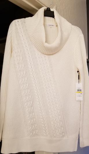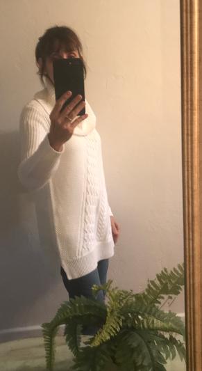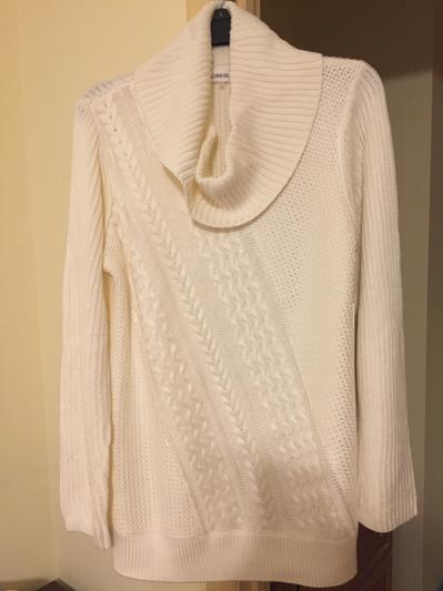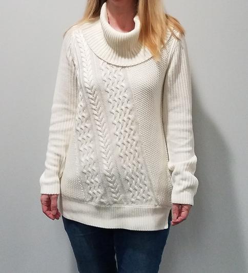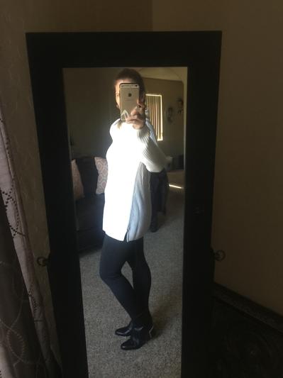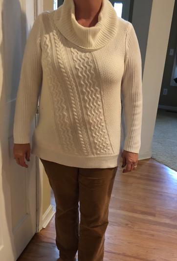 The sweater fits perfectly, looks great with a pair of leggings, jeans or dress pants. Very comfortable and warm. Love the weaving on the front. Wore to work and got lots of compliments.