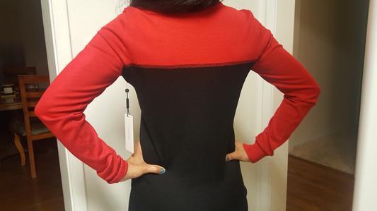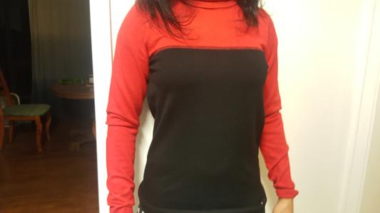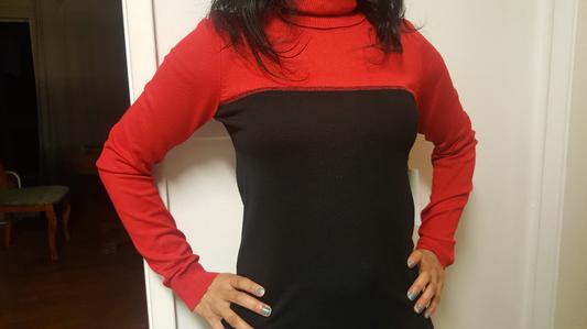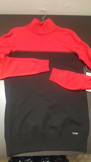 Lovely thin knit. Classy CK metal tag at bottom. Wore with cami & was perfect. Perfect with black pants. Could dress up or down. This is a staple piece, not a one year piece. The red is a true red. The turtleneck is not binding. Fits great. Washed perfectly. Great value.