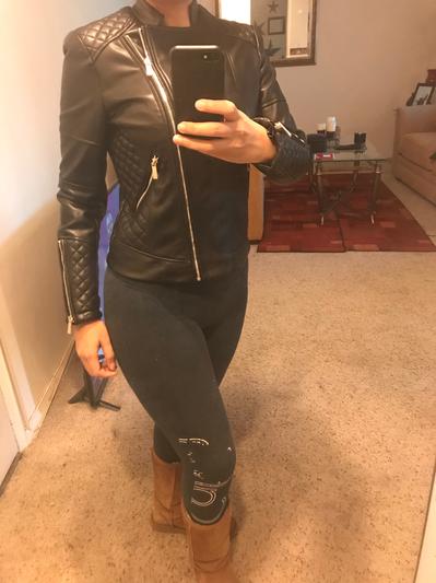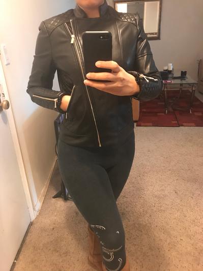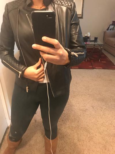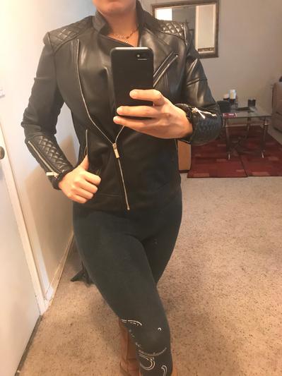 I love this moto jacket. Really well made. Soft and supple. The quilting makes it really different. Can wear with anything. I would suggest if ordering you go up one size as it is a little smaller than I thought. Still love it.
