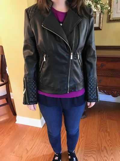 This jacket is so chic! Wearing it is so fun and I feel so stylish. It's a modern update to the classic moto jacket and is definitely on trend but still a classic style that won't go out of date next year. It runs a bit snug but I think it will ease with wear. Love this new addition to my wardrobe!