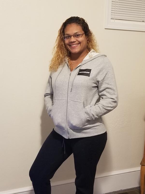 This logo hoodie has a great look to it. Also, it fits true to size. The inside of the hoodie is nice and soft and the zipper zips nice and easily. I love the color of the sweater it looks amazing.