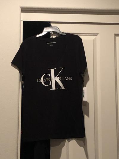 If you are looking for a basic t-shirt then this is it. The standout on this shirt is two things, the v-neck and the logo which is in a glittery sliver. Plus it isn't 100 percent cotton so it feels a little silky. I like the t-shirt. It isn't anything fancy, it's perfectly fine for what it is.