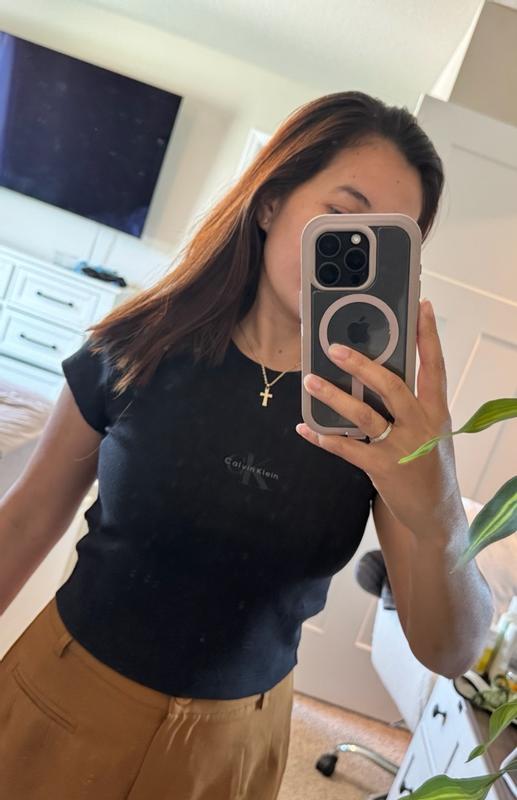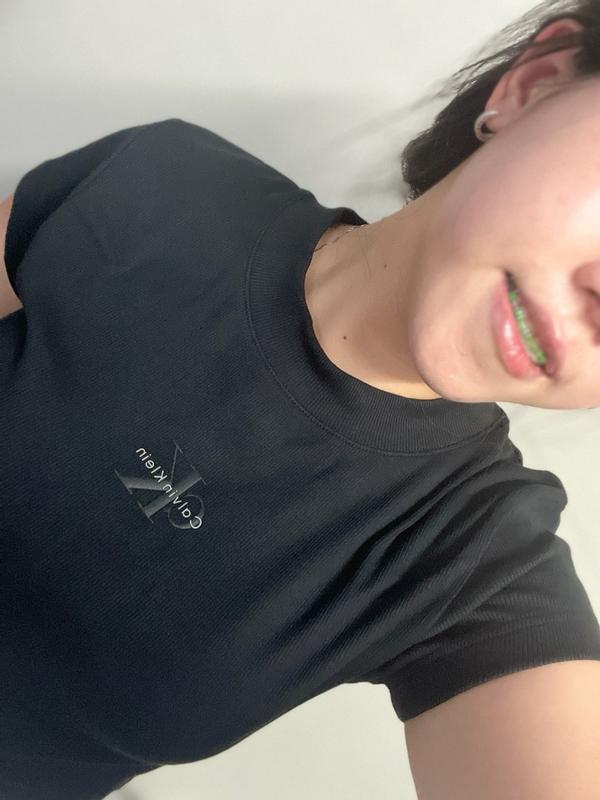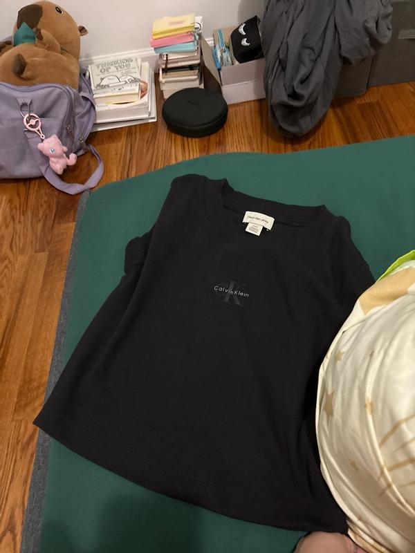 Love this shirt. Very comfortable and great fit. Simple, while being all black with a small ck design in front. Quality is great. However the price is ridiculous for a small cropped shirt.