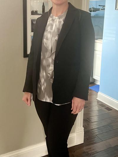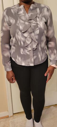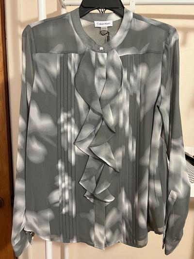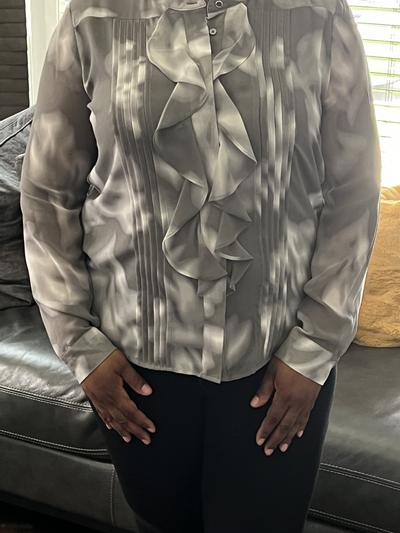 This blouse looks better in person than it does in the picture online. It’s a pretty gray color with some white whisps mixed in. The ruffle down the front is not obnoxiously big or fluffy. The blouse is very lightweight. The sleeves are almost sheer, but the body of the blouse, both front and back, are lined. I often mix and match Calvin Klein blouses between work and casual outfits but this one really only works for work.