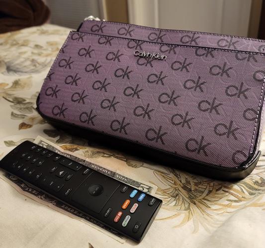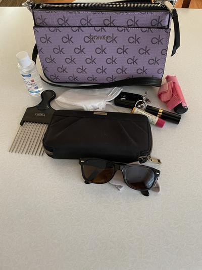 This is a cute little bag. I love that it has the option of having a shoulder strap or a handbag strap, with both being removable. Love the two functional outer pockets on each side of the handbag to store my phone, and able to get it easily without rummaging through the stuff inside the bag. The purse is roomy enough for a phone, wallet, and other small accessories. The only drawback for me is that the bag is stiff and not flexible. The shiny surface on the bag with the printed CK logo all over and the gold hardware is a little too splashy. Overall quality of the bag is good.