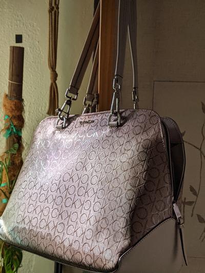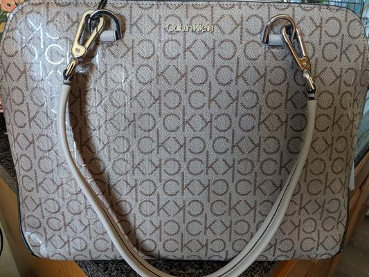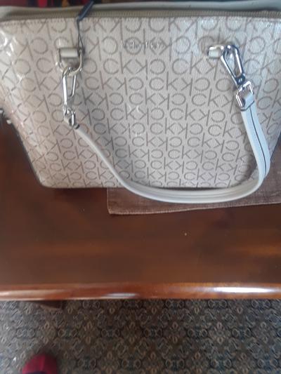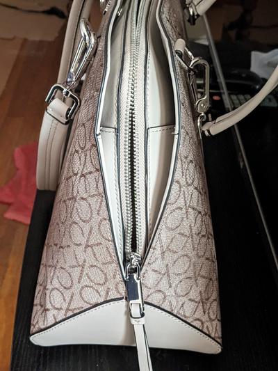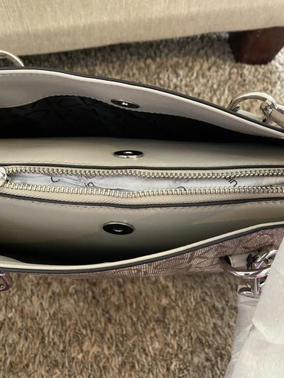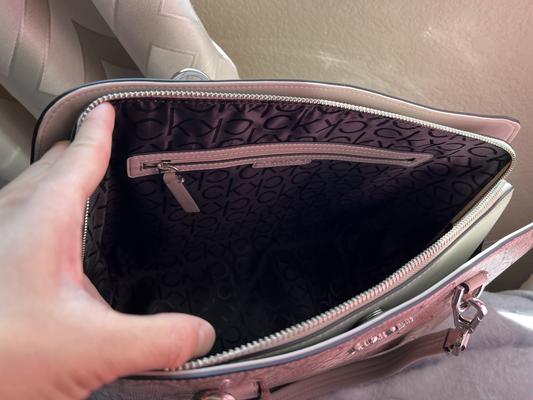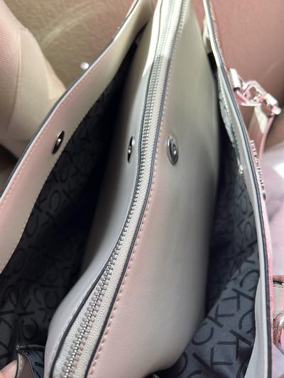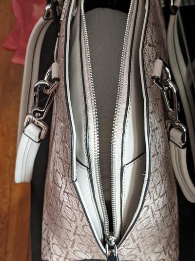 Beautiful bag. Looks classy! Roomy and spacious. Perfect work bag. I love the pink top handles and belt.
